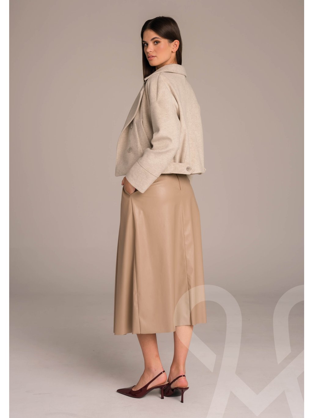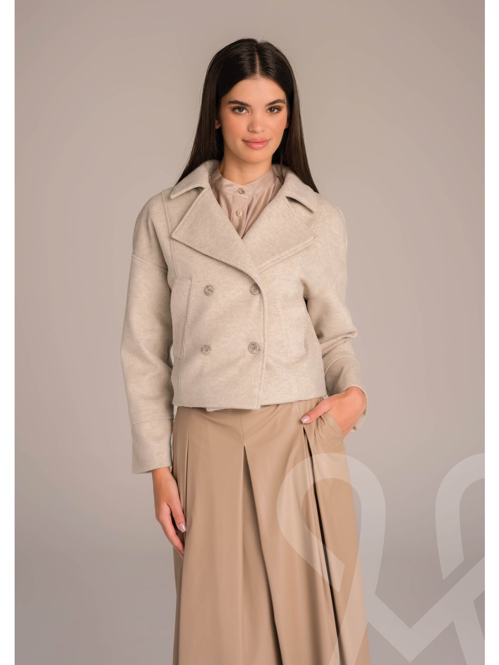 MAGENTA kabát v béžovej farbe krátkeho strihu. Zapínanie na dva rady gombíkov, vhodný na prechodné obdobie. Ĺahko kombinovateľný.