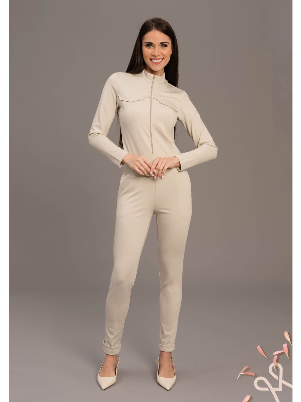 Elegantný béžový MAGENTA overal je dokonalým spojením minimalizmu a sofistikovaného štýlu. Priliehavý strih krásne zvýrazní siluetu, zatiaľ čo pružný a príjemný materiál zabezpečí maximálne pohodlie počas celého dňa. Dlhé rukávy a jemný stojačik so zipsom dodávajú modelu moderný, športovo-elegantný nádych. Jednofarebné prevedenie umožňuje jednoduché kombinovanie s lodičkami pre elegantný look alebo so štýlovými teniskami pre uvoľnenejší outfit. Nadčasový kúsok, ktorý podčiarkne ženskosť a sebavedomie pri každej príležitosti.