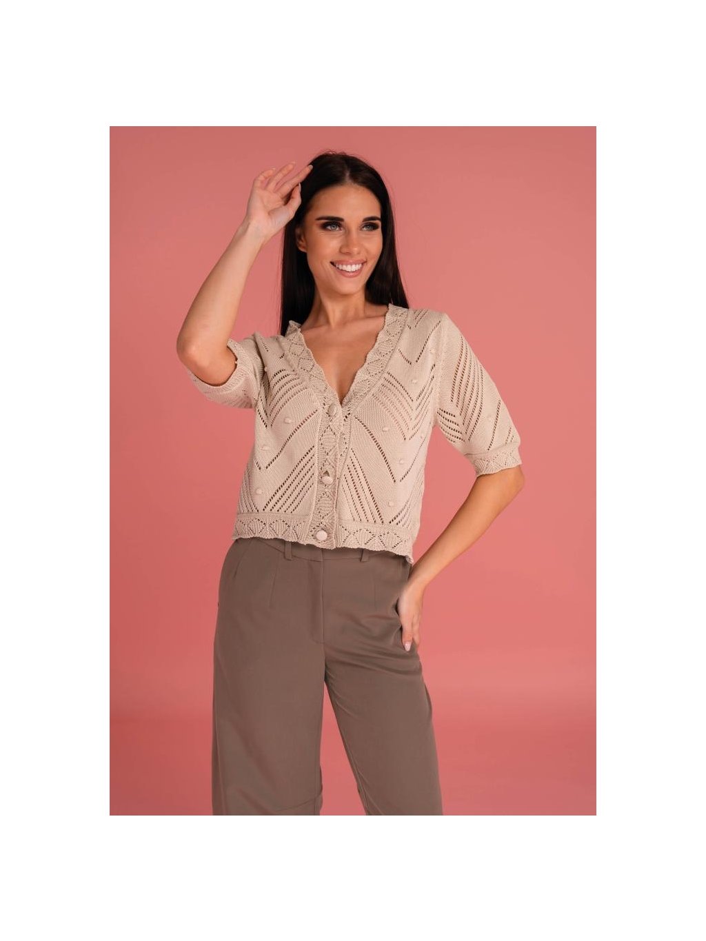 MAGENTA sveter pôsobí jemne, žensky a elegantne. Je univerzálnej veľkosti a je upletený v svetlej béžovej farbe a má kratší, priliehavejší strih, ktorý pekne zvýrazňuje siluetu. Vyznačuje sa dekoratívnym dierkovaným vzorom v kombinácii s drobnými plastickými detailmi, ktoré mu dodávajú zaujímavú textúru a vizuálnu ľahkosť. Výstrih do tvaru V je lemovaný jemným ozdobným okrajom a zapínanie na gombíky vpredu podčiarkuje jeho klasický, no zároveň romantický charakter. Rukávy sú kratšie, zakončené pružným lemom, vďaka čomu sveter pôsobí upravene a pohodlne. Celkovo ide o elegantný kúsok vhodný na vrstvenie aj samostatné nosenie, ideálny na ležérne aj jemne formálne outfity.