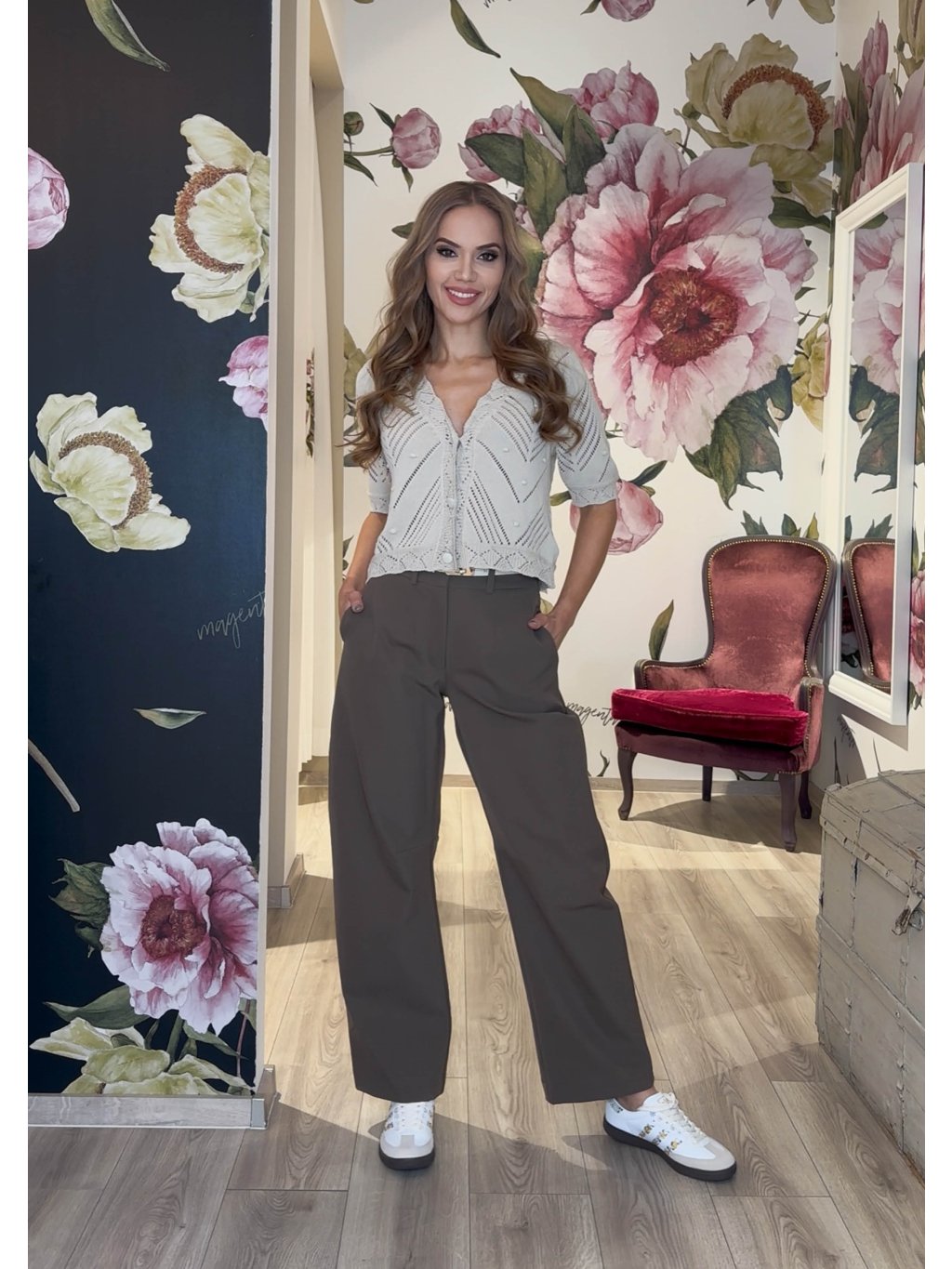 Pletený MAGENTA top v jemnom smotanovom odtieni zaujme elegantnou ažúrovou štruktúrou, ktorá mu dodáva ľahkosť a ženský šarm. Precízne spracovaný vzor vytvára zaujímavý vizuálny efekt a zároveň zabezpečuje vzdušnosť, ideálnu na teplejšie dni. Krátke rukávy po lakte a rovný strih pôsobia moderne a pohodlne, pričom top jemne kopíruje postavu bez obopínania. Okrúhly výstrih podčiarkuje čistý a nadčasový dizajn. Tento model je skvelou voľbou na bežné nosenie aj neformálne príležitosti a ľahko sa kombinuje s nohavicami či sukňou pre svieži, elegantný outfit.