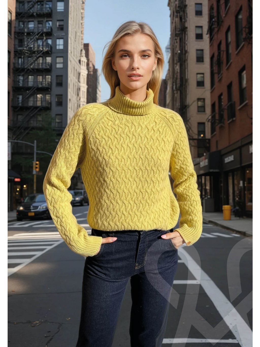 Tento MAGENTA pletený top má žltú farbu, rolákový golier a výrazný vrkočový pletený vzor. Je z hrubšieho, mäkkého materiálu, s dlhými rukávmi a mierne voľným, pohodlným strihom – ideálny na chladnejšie dni.