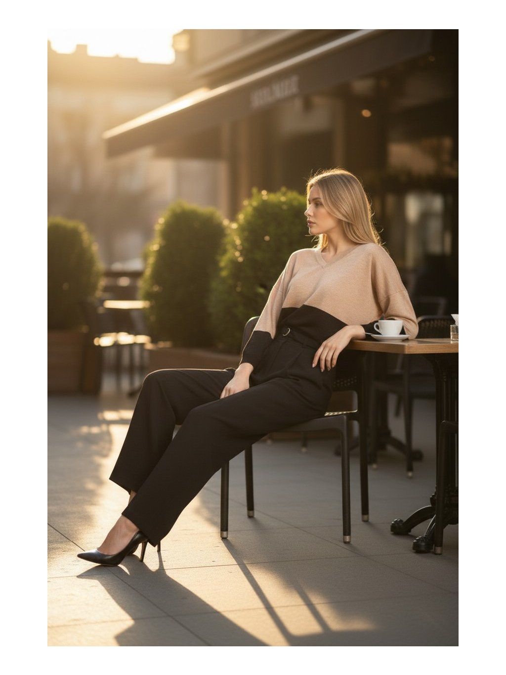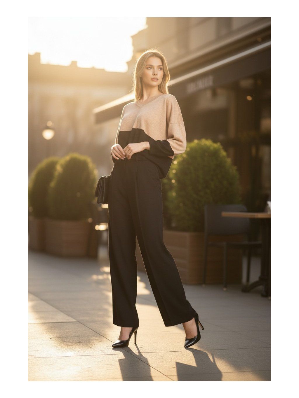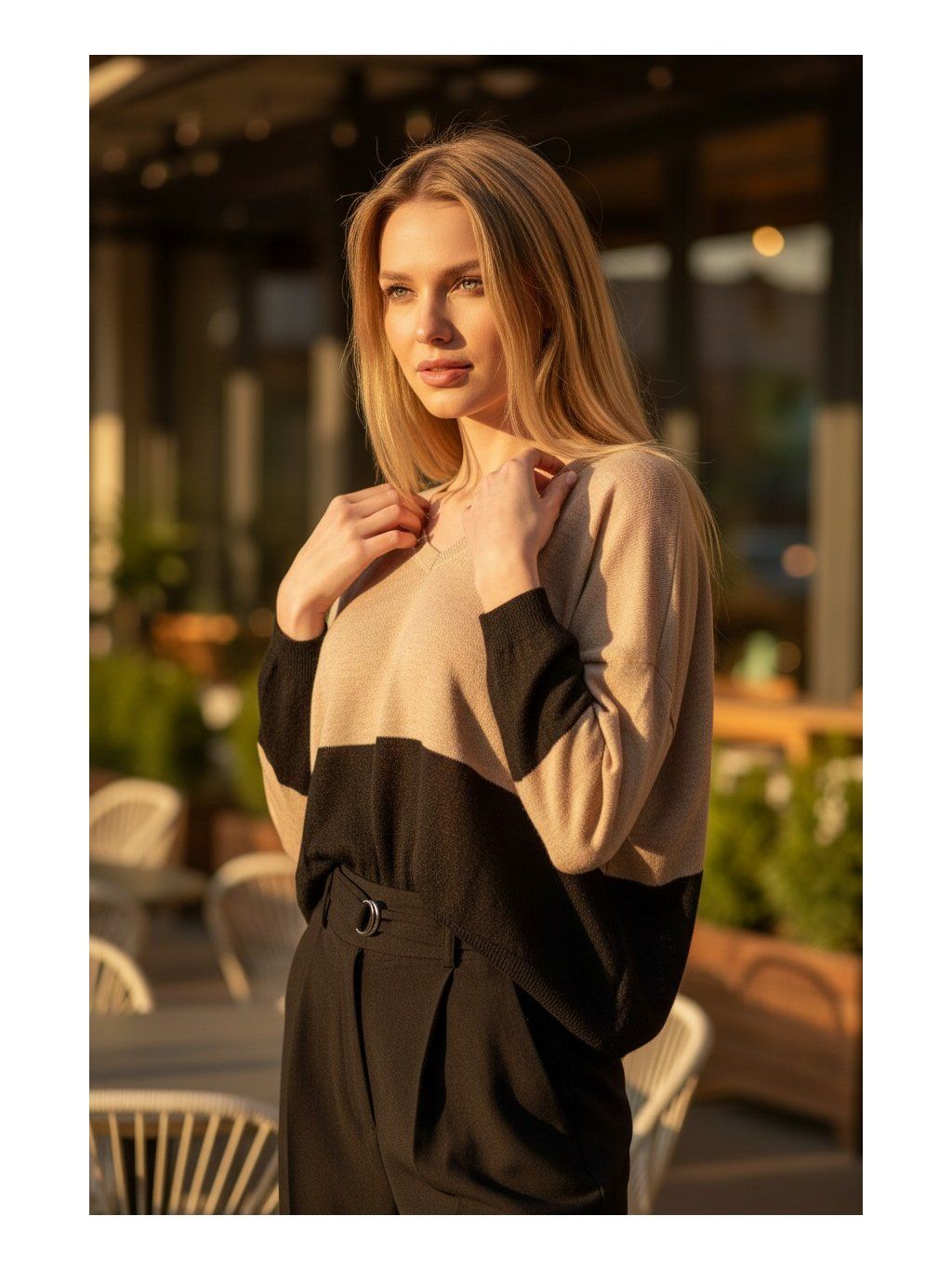 MAGENTA pletený top, ktorý pôsobí elegantne a zároveň uvoľnene, vďaka svojmu modernému strihu a jemnej farebnej kombinácii. Má voľnejší, mierne oversize strih s dlhými rukávmi, ktoré sa smerom k zápästiam zužujú. Horná časť topu je v teplom béžovom odtieni, ktorý prechádza do kontrastného čierneho bloku v spodnej časti a na rukávoch, čím vytvára zaujímavý farebný efekt. Materiál pôsobí ľahko a príjemne na dotyk, čo z neho robí ideálny kúsok na každodenné nosenie aj elegantnejšie príležitosti. Výstrih je jemne večkový a decentný, čo podčiarkuje ženskosť celkového vzhľadu. Tento top sa ľahko kombinuje s nohavicami či sukňou a dodáva outfitu štýlový, no zároveň nenútený charakter.