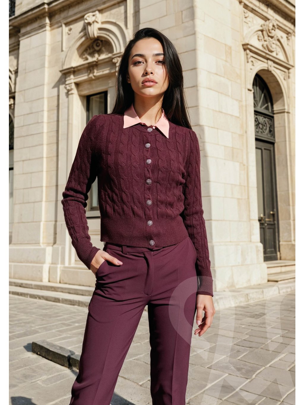 MAGENTA dámsky pletený top s výrazným vrkočovým vzorom po celej ploche. Zapínaný na gombíky vpredu a pôsobí elegantne a jemne retro. Strih je klasický – priliehavý, s dlhými rukávmi a patentovým zakončením na rukávoch aj v páse. Celkovo pôsobí sviežo, ženský a sofistikovane.