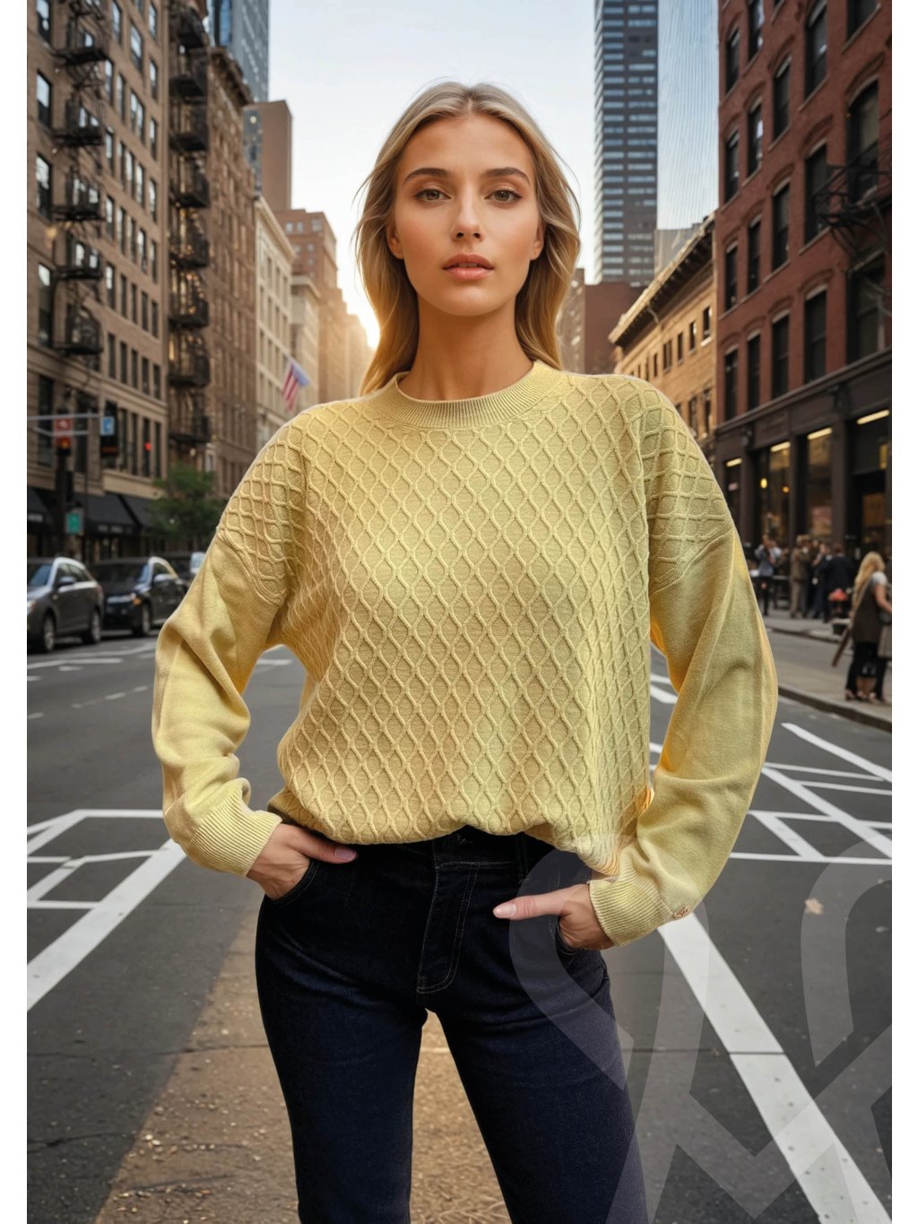 Magenta pletený top žltejfarby, s jemným diamantovým vzorom po celej prednej časti. Má okrúhly výstrih, dlhé rukávy a voľnejší strih, ktorý pôsobí ležérne, no zároveň elegantne.