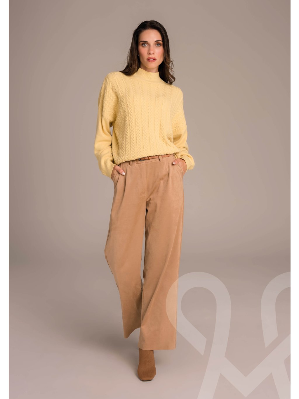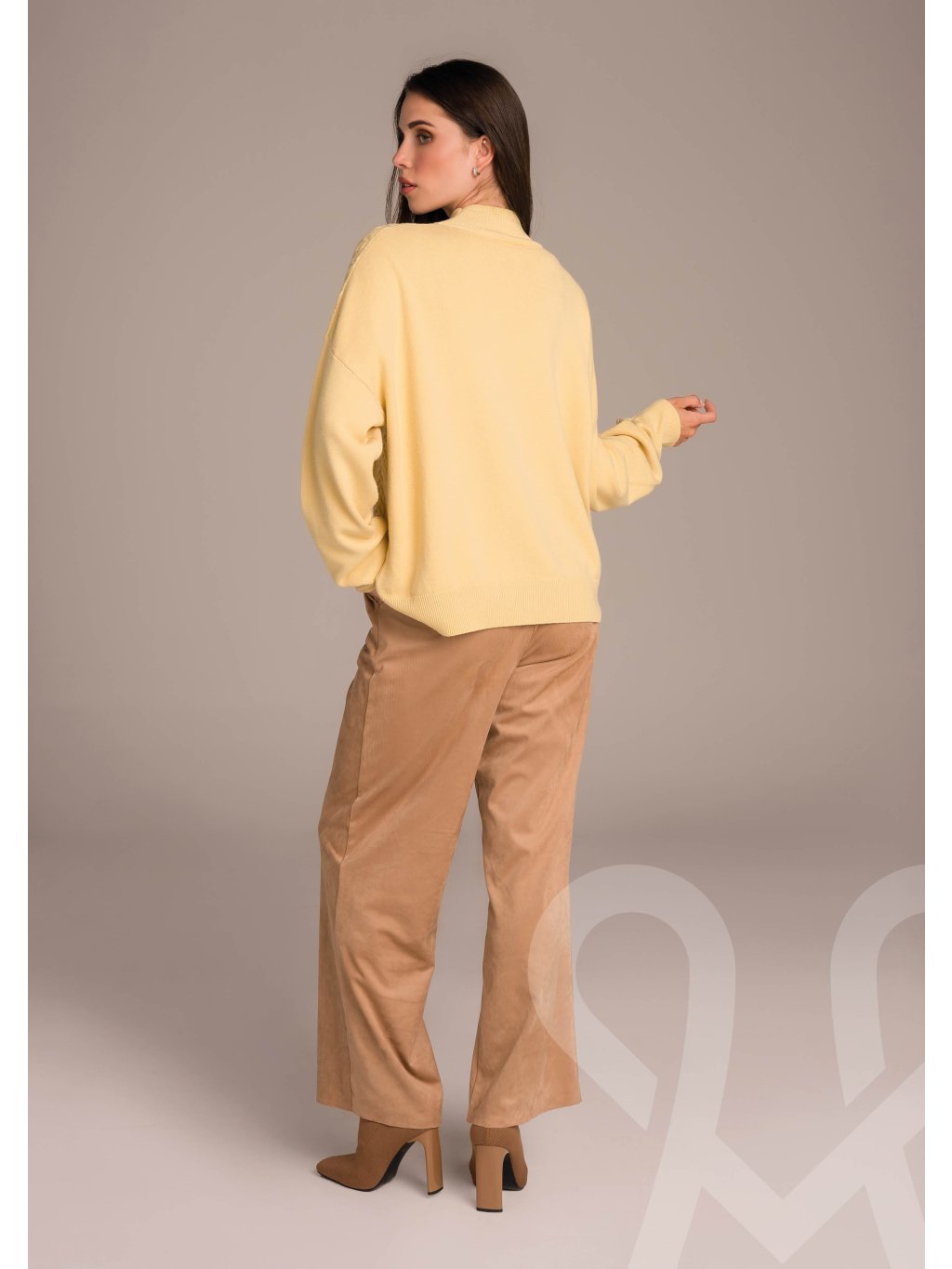 Pletený top je vo svetložltej farbe, s voľnejším strihom a vysokým okrúhlym golierom. Predná časť je zdobená výrazným vrkočovým vzorom, rukávy sú dlhé a mierne spustené, čo pôsobí pohodlne a ležérne.
