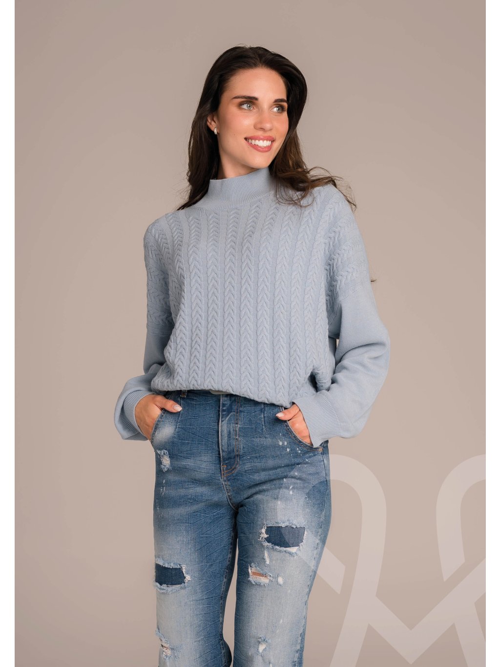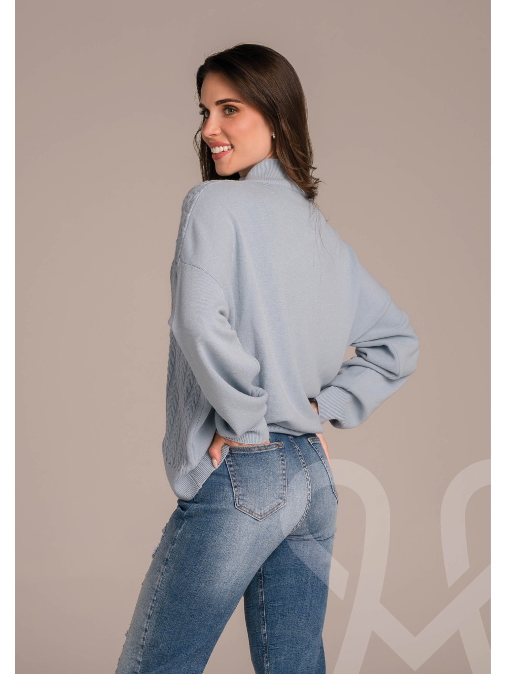 MAGENTA svetlomodrý pletený top spája eleganciu, pohodlie a nadčasový štýl. Jemný úplet s klasickým vrkočovým vzorom pôsobí žensky a zároveň útulne, vďaka čomu je ideálnym kúskom na chladnejšie dni. Voľnejší strih a mäkký materiál zabezpečujú maximálne pohodlie pri nosení, zatiaľ čo stojací golier dodáva modelu moderný a sofistikovaný nádych. Top sa výborne kombinuje s džínsami, elegantnými nohavicami či sukňou – perfektne doplní tvoj outfit do práce, mesta aj na voľný čas.