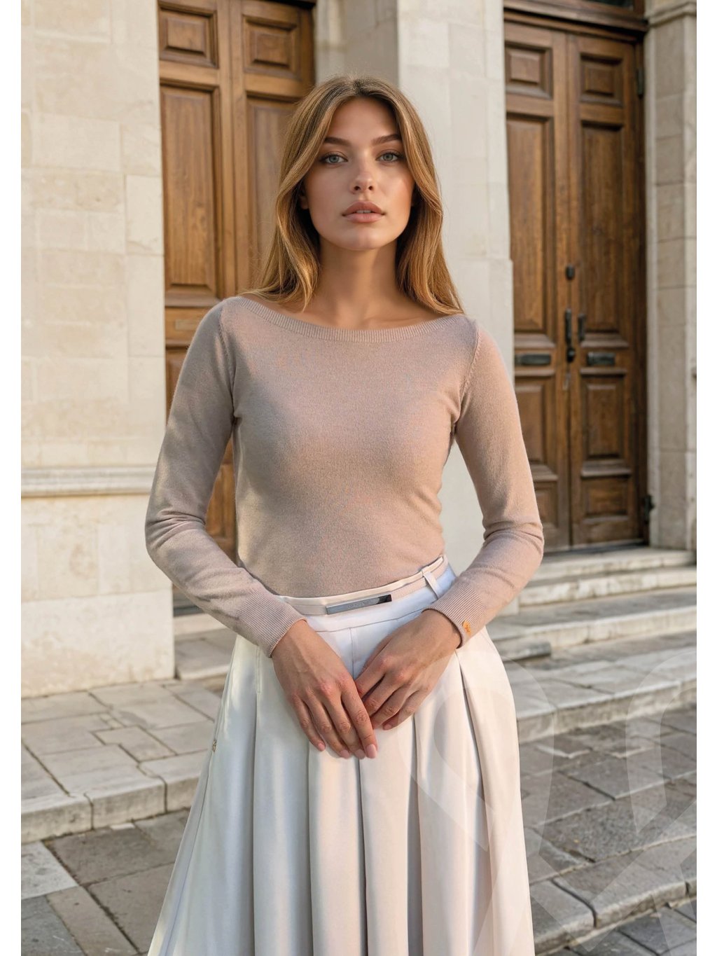 Top je jemný, svetlobéžovej farby, s dlhými rukávmi a lodičkovým výstrihom. Má priliehavý strih, ktorý elegantne kopíruje postavu, a pôsobí minimalisticky a nadčasovo.
