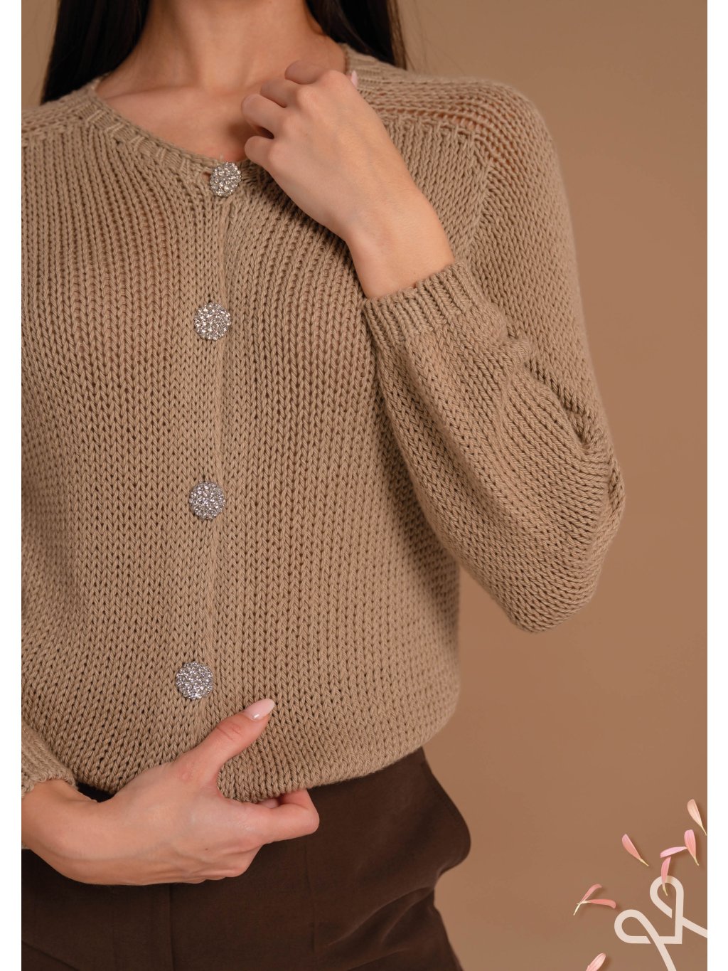Elegantný pletený MAGENTA top v teplom béžovom odtieni je dokonalým spojením pohodlia a sofistikovaného štýlu. Jemná, husto pletená štruktúra pôsobí luxusne a príjemne zahreje počas chladnejších dní. Výrazné ozdobné gombíky dodávajú modelu jedinečný charakter a šperkársky akcent, ktorý oživí celý outfit. Klasický strih s dlhým rukávom sa ľahko kombinuje s nohavicami aj sukňou a vytvára nadčasový look vhodný do práce aj na voľný čas. Ideálny kúsok pre ženy, ktoré milujú eleganciu s jemným detailom.