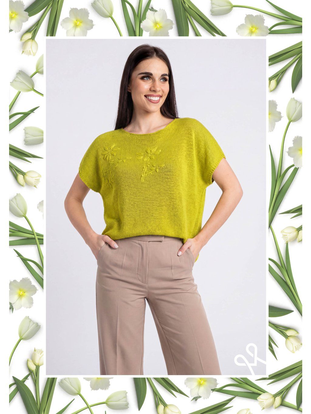 Zelený MAGENTA pletený top zaujme na prvý pohľad svojou výraznou farbou, ktorá pôsobí sviežo, žensky a energicky. Má voľnejší, pohodlný strih s krátkymi rukávmi, ktoré jemne splývajú cez ramená a dodávajú mu ležérny charakter. Výstrih je okrúhly a decentný, čo zvýrazňuje jednoduchosť a univerzálnosť tohto kúsku.