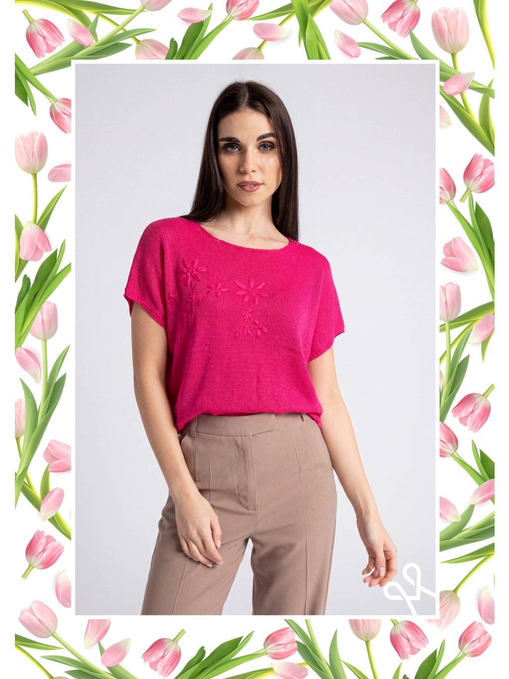 Sýtoružový MAGENTA pletený top zaujme na prvý pohľad svojou výraznou farbou, ktorá pôsobí sviežo, žensky a energicky. Má voľnejší, pohodlný strih s krátkymi rukávmi, ktoré jemne splývajú cez ramená a dodávajú mu ležérny charakter. Výstrih je okrúhly a decentný, čo zvýrazňuje jednoduchosť a univerzálnosť tohto kúsku.