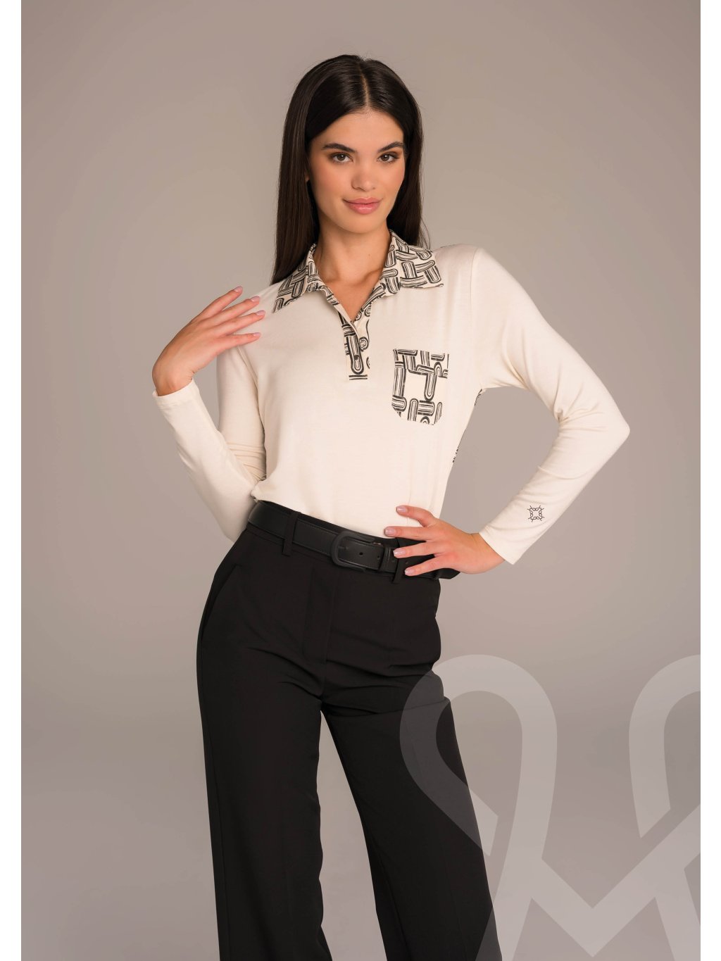 MAGENTA dámsky top s dlhým rukávom v elegantnom štýle, ktoré spája pohodlie s decentnou sofistikovanosťou. Tričko má krémovo-bielu farbu a je vyrobené z jemného, elastického materiálu, ktorý sa príjemne prispôsobí postave. Výrazným prvkom modelu je golier a náprsné vrecko z látky s grafickým vzorom, ktorý dodáva tričku originálny a módny charakter. Rovnaký motív sa opakuje aj na lemovaní výstrihu so zapínaním na gombíky, čím sa vytvára harmonický kontrast s jednofarebným telom trička. Na rukáve je decentne umiestnené malé logo alebo ozdobná výšivka, ktorá podčiarkuje jeho prémiový vzhľad. Tento kúsok je ideálny do práce, na stretnutia či voľnočasové nosenie – elegantný, no zároveň pohodlný a ľahko kombinovateľný.