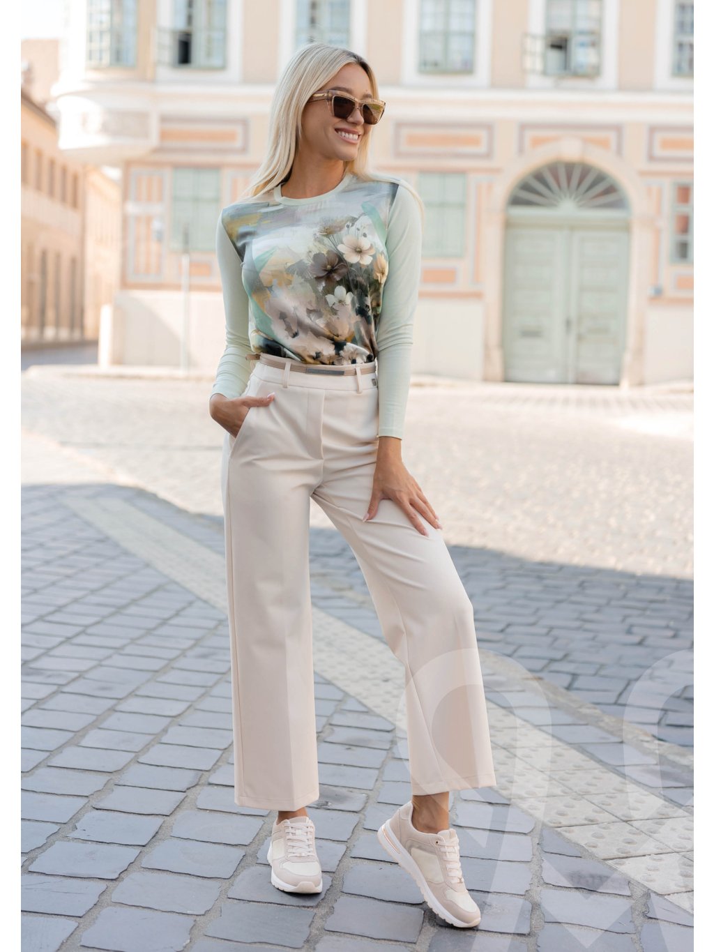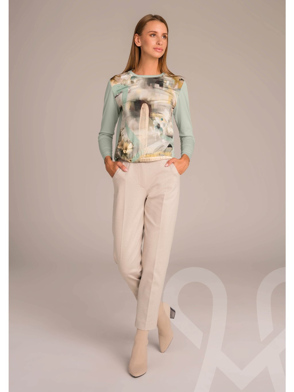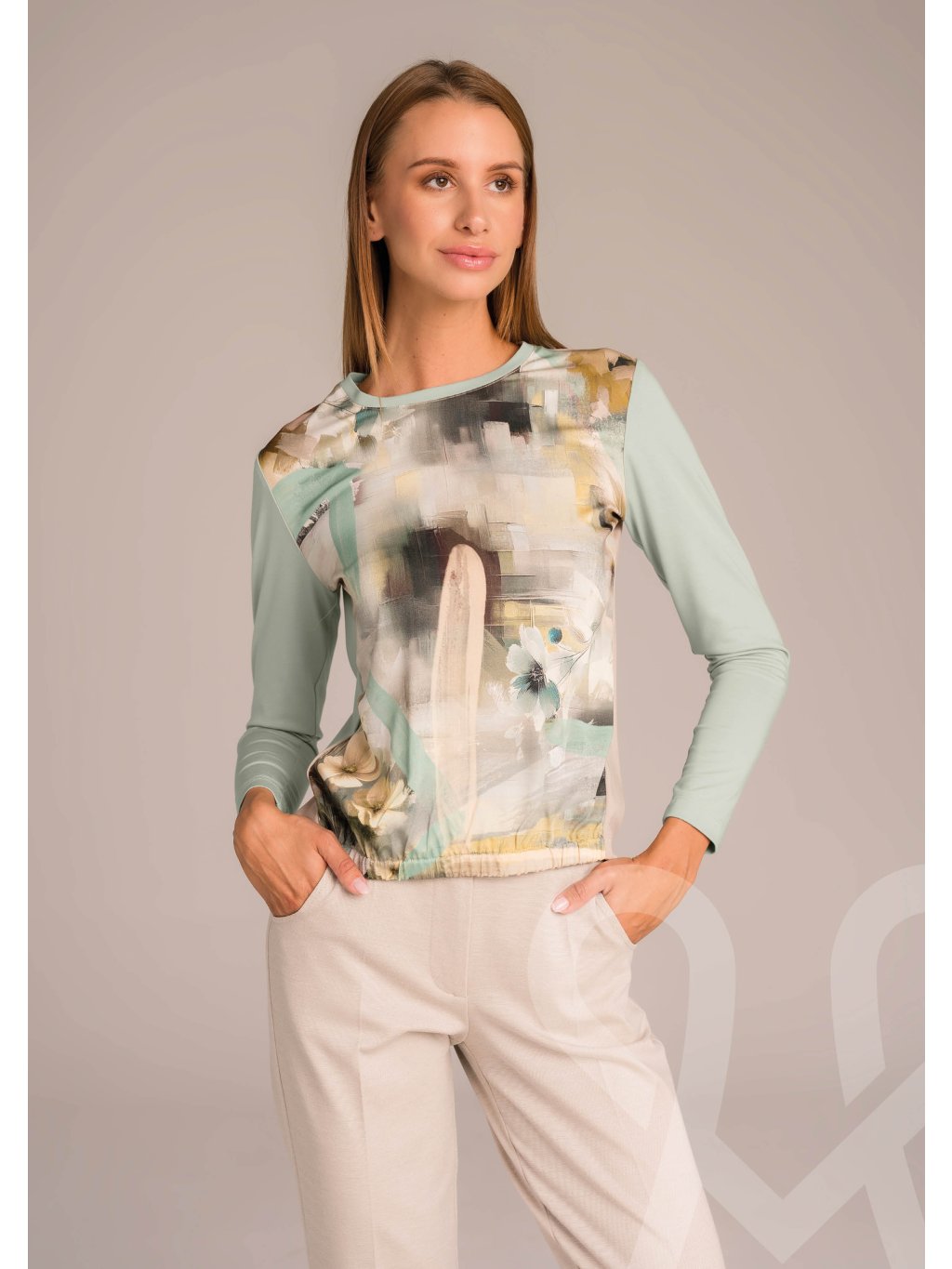 Vzorovaný MAGENTA top s potlačou na prednej strane a jednofarebnými rukavmi,okrúhlym výstrihom ohraničený patentom rovnakej farby ako na rukávoch. Na spodnej strane ukončený gumičkou. Skvele ladí s nohavicami alebo sukňou v béžovej/taupe farbe, môže sa nosiť s doplnkami v jemných zemitých odtieňoch alebo s bielou/krémovou spodnou časťou.