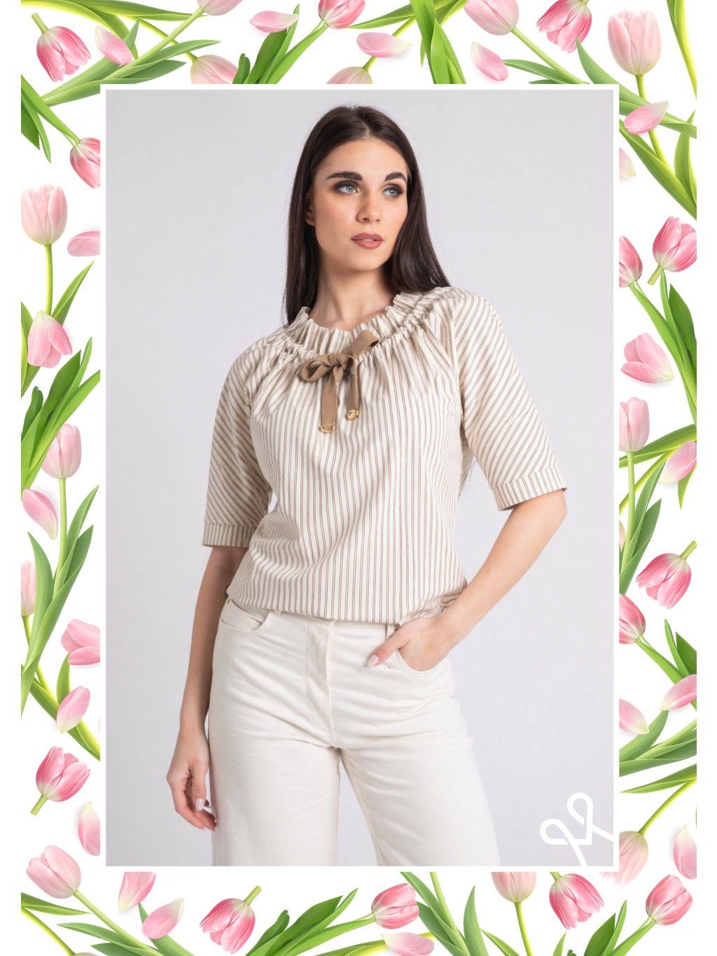 Elegantný dámsky MAGENTA top s jemným prúžkovaným vzorom je ideálnou voľbou pre sofistikovaný a ženský vzhľad. Ľahký a príjemný materiál zabezpečuje pohodlie počas celého dňa, zatiaľ čo kombinácia neutrálnych odtieňov pôsobí vkusne a nadčasovo.Top zaujme detailom viazania pri krku, ktorý dodáva outfitu jemný romantický nádych. Kratšie rukávy a mierne voľný strih zabezpečujú komfort a zároveň lichotia postave. Skvele sa hodí k elegantným nohaviciam či sukni, takže je perfektnou voľbou do práce aj na spoločenské príležitosti.