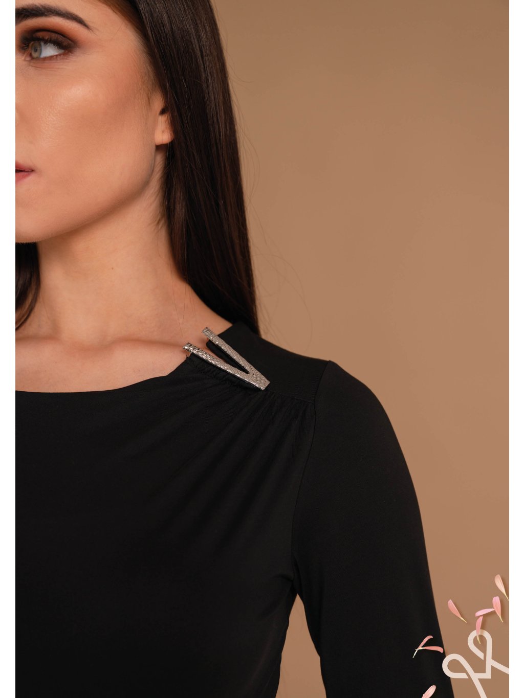 Dominantným prvkom je originálna kovová aplikácia umiestnená na ramene pri výstrihu. Tento dekoratívny detail v striebornom tóne dodáva topu moderný, mierne šperkovo pôsobiaci akcent a robí z neho výrazný, no stále vkusný kúsok. Jemné riasenie v oblasti ramena pod aplikáciou zmäkčuje celkový vzhľad a pridáva modelu zaujímavú textúru.