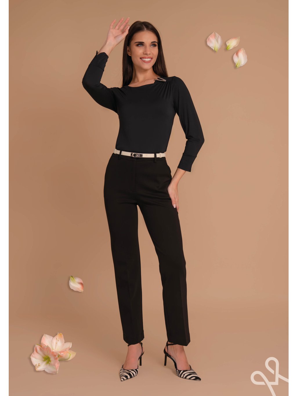 Top MAGENTA v čiernom prevedení je stelesnením nadčasovej elegancie a minimalistického luxusu. Má priliehavý, no stále komfortný strih, ktorý jemne kopíruje siluetu a zvýrazňuje ženské línie bez pôsobenia príliš obtiahnuto. Lodičkový výstrih pôsobí veľmi sofistikovane a decentne odhaľuje oblasť kľúčnych kostí, čím dodáva modelu jemnú ženskosť.