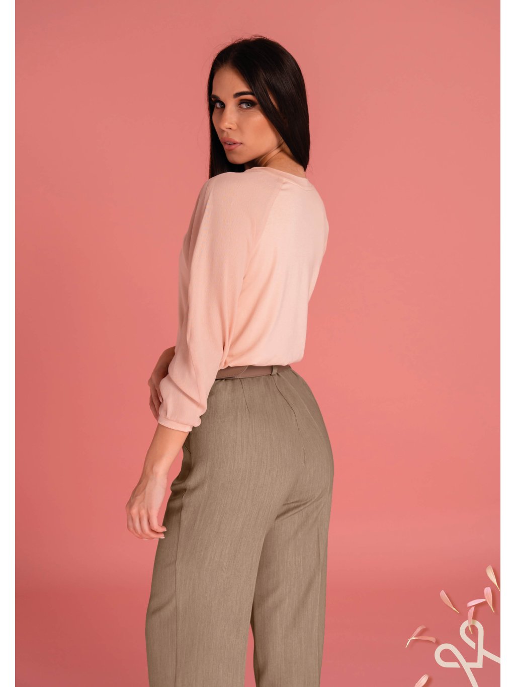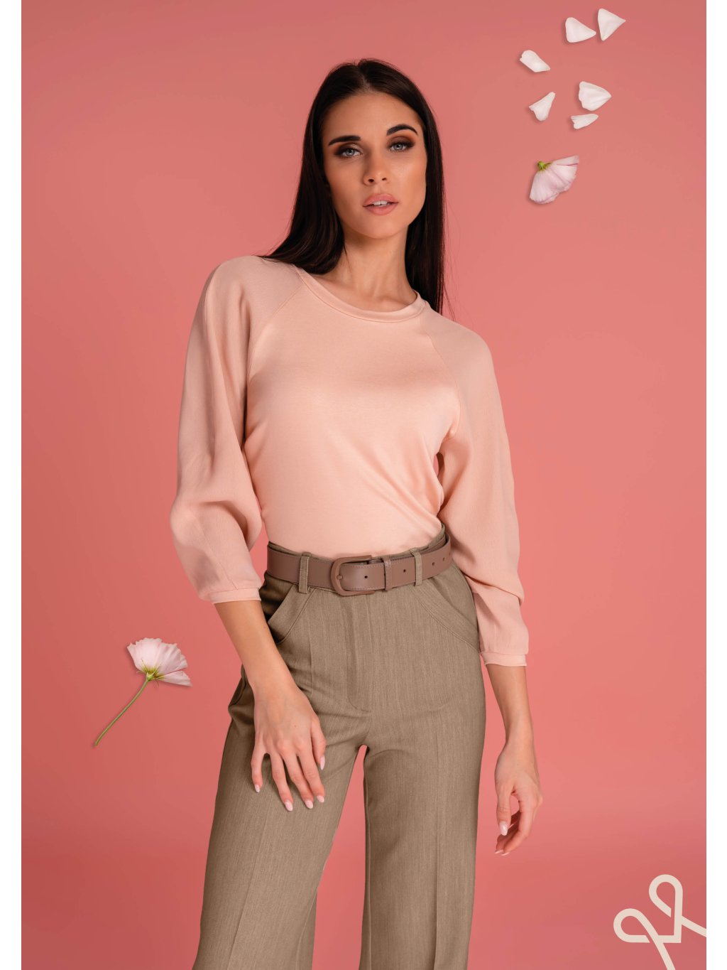 MAGENTA top na obrázku pôsobí jemne, elegantne a veľmi žensky. Je v nežnom púdrovo-ružovom odtieni a má jednoduchý, čistý strih, ktorý pekne zvýrazňuje siluetu bez pôsobenia tesne. Okrúhly výstrih je decentný a doplnený jemným lemovaním. Rukávy sú trojštvrťovej dĺžky, mierne nariasené v oblasti ramien, vďaka čomu top získava mäkký, romantický charakter. Materiál pôsobí hladko, ľahko a príjemne na nosenie. Celkový dojem je sofistikovaný a univerzálny, vhodný na elegantné denné outfity aj do práce v kombinácii s nohavicami či sukňou.