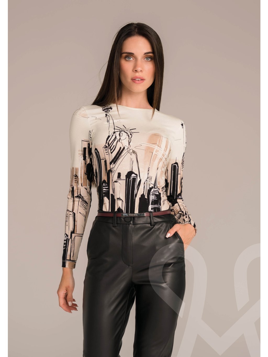 Priliehavý MAGENTA top v béžovej farbe s výraznou abstraktnou potlačou. Najčastejšie sa nosí so štýlovými nohavicami alebo sukňou v kombinácii s čiernymi nohavicami, vyzerá elegantne a moderné.