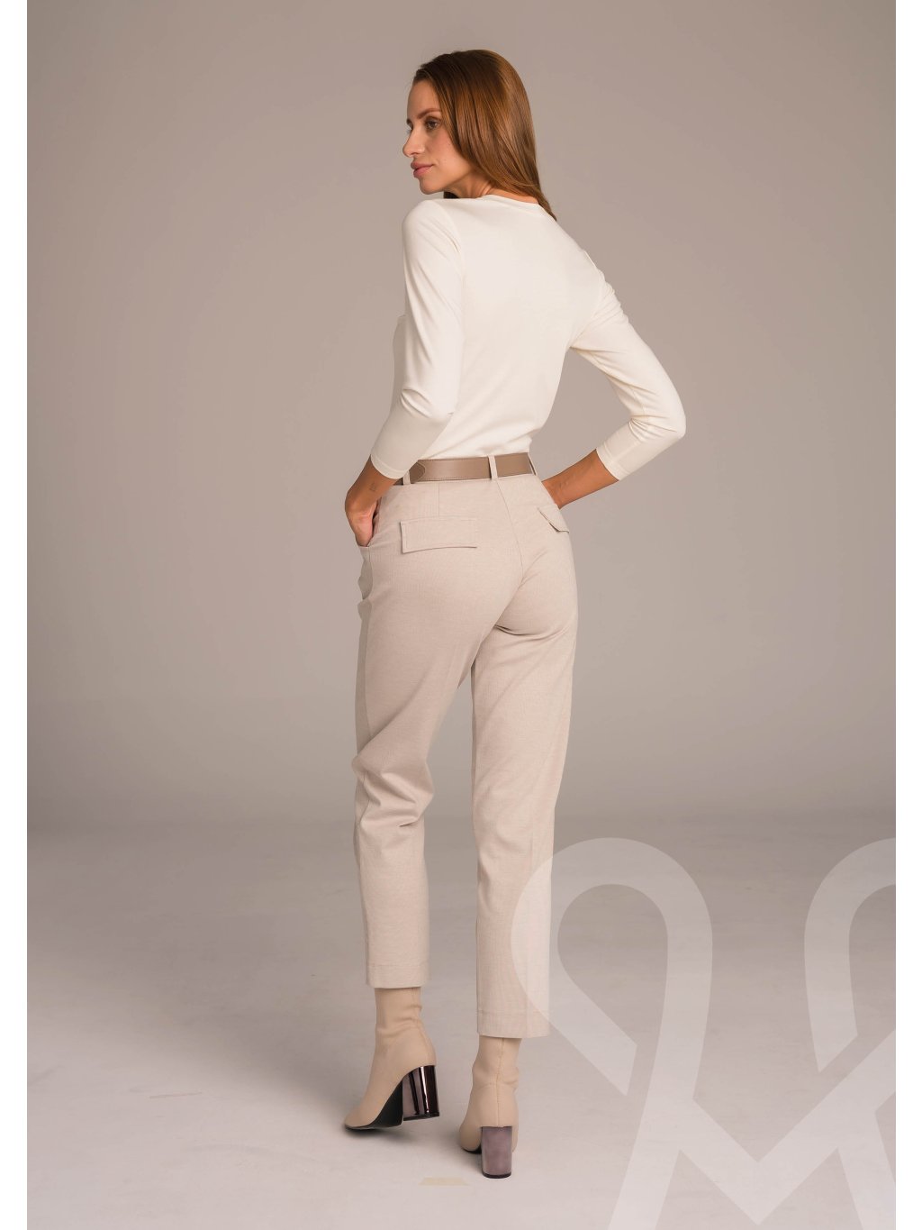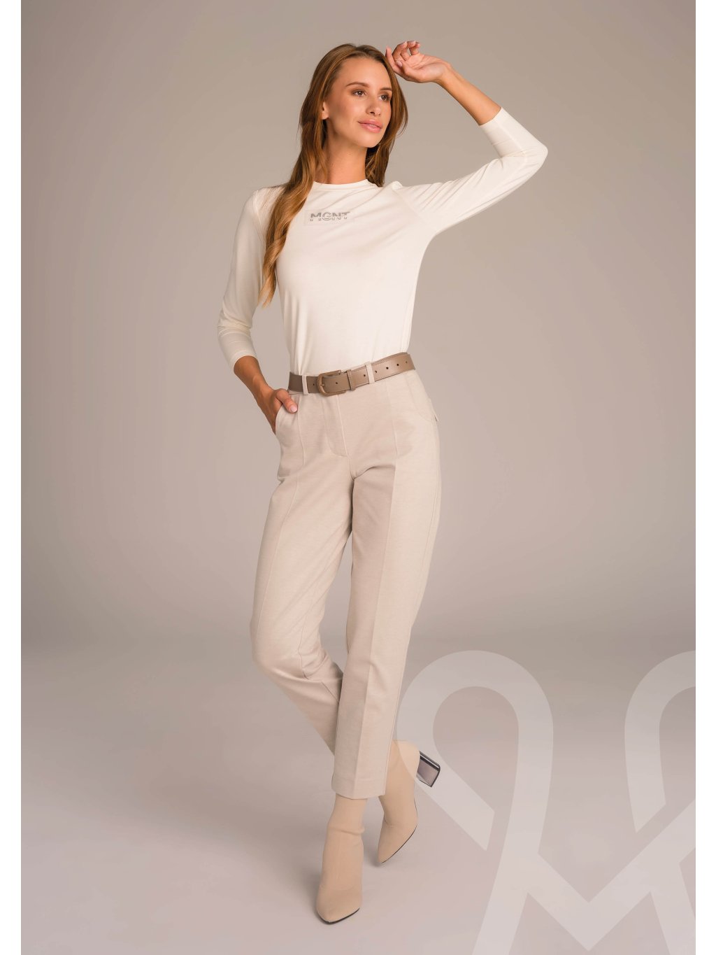 MAGENTA dámsky béžový top s dlhým rukávom. Priliehavý vrchný diel sa ľahko prispôsobí postave. Potlač loga na hrudi . Skvele sa hodí na denné nosenie aj do práce v kombinácii s nohavicami alebo sukňou. Lichotivý prešítý strih zdôrazňuje pás.