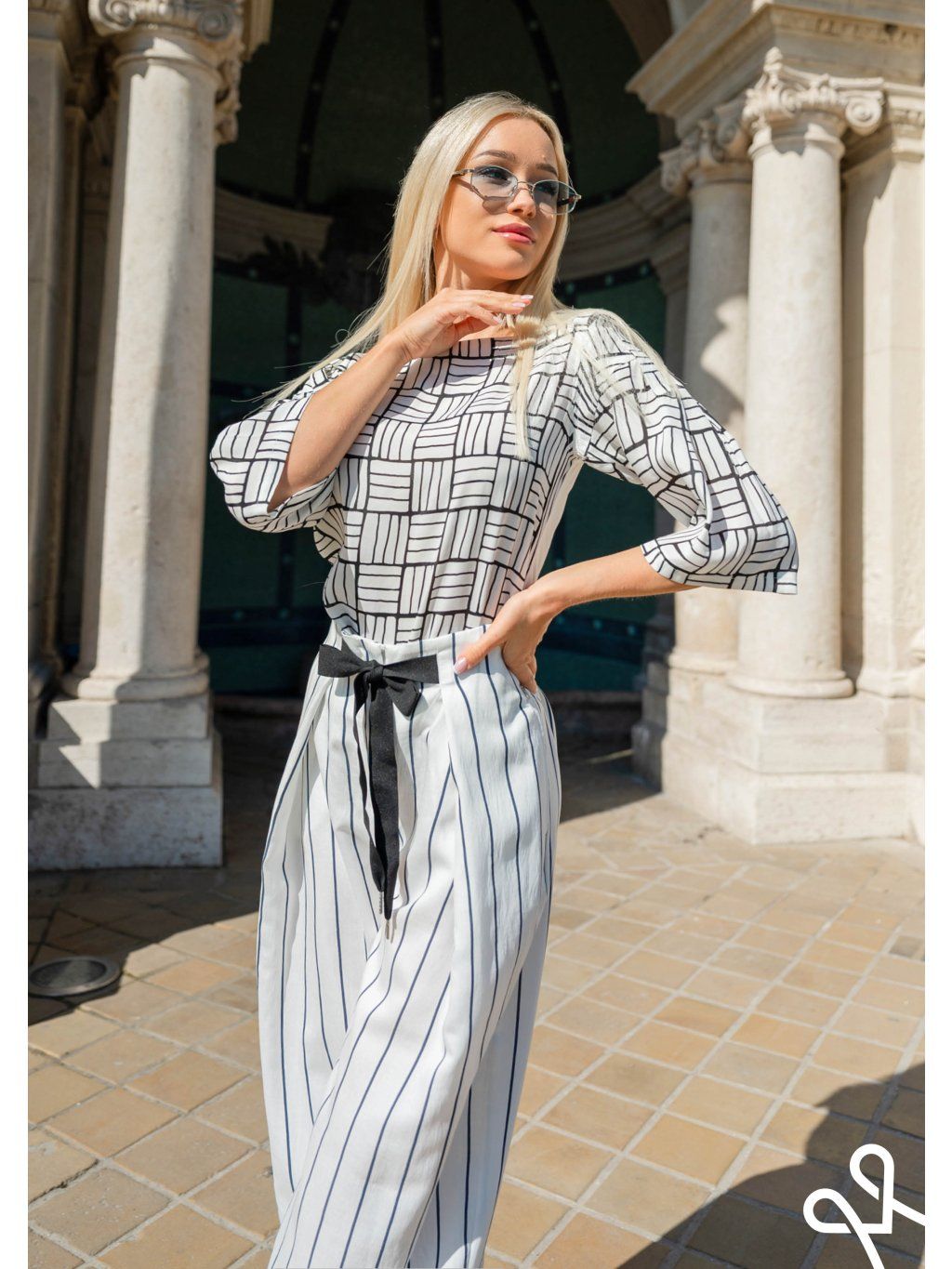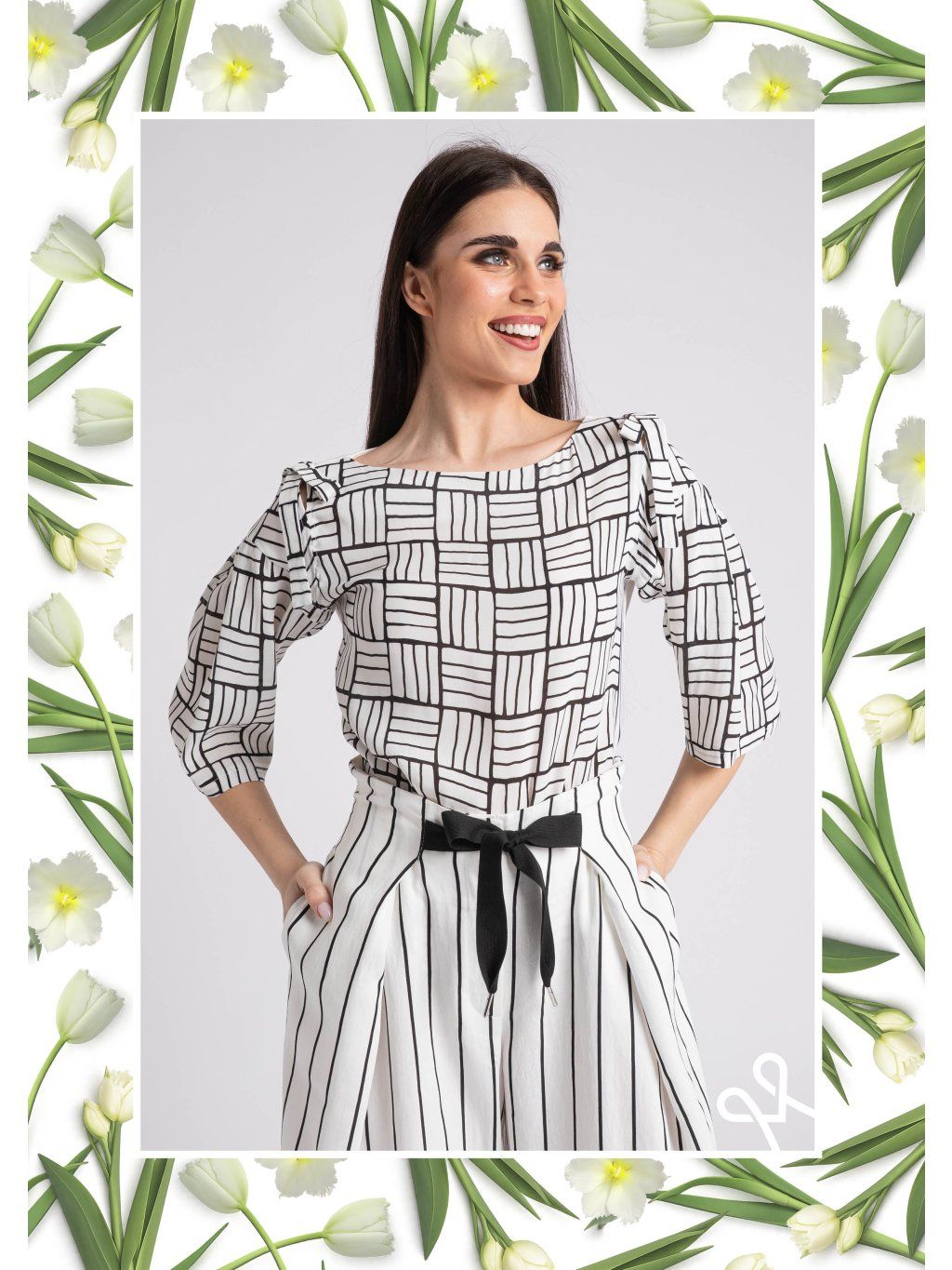 Top značky MAGENTA zaujme originálnym geometrickým vzorom, ktorý dodáva outfitu moderný a výrazný charakter. Kombinácia kontrastných línií na svetlom podklade pôsobí sviežo, no zároveň elegantne, vďaka čomu sa top hodí na rôzne príležitosti.