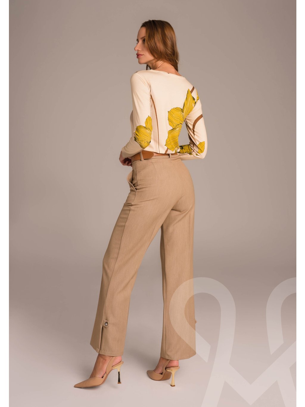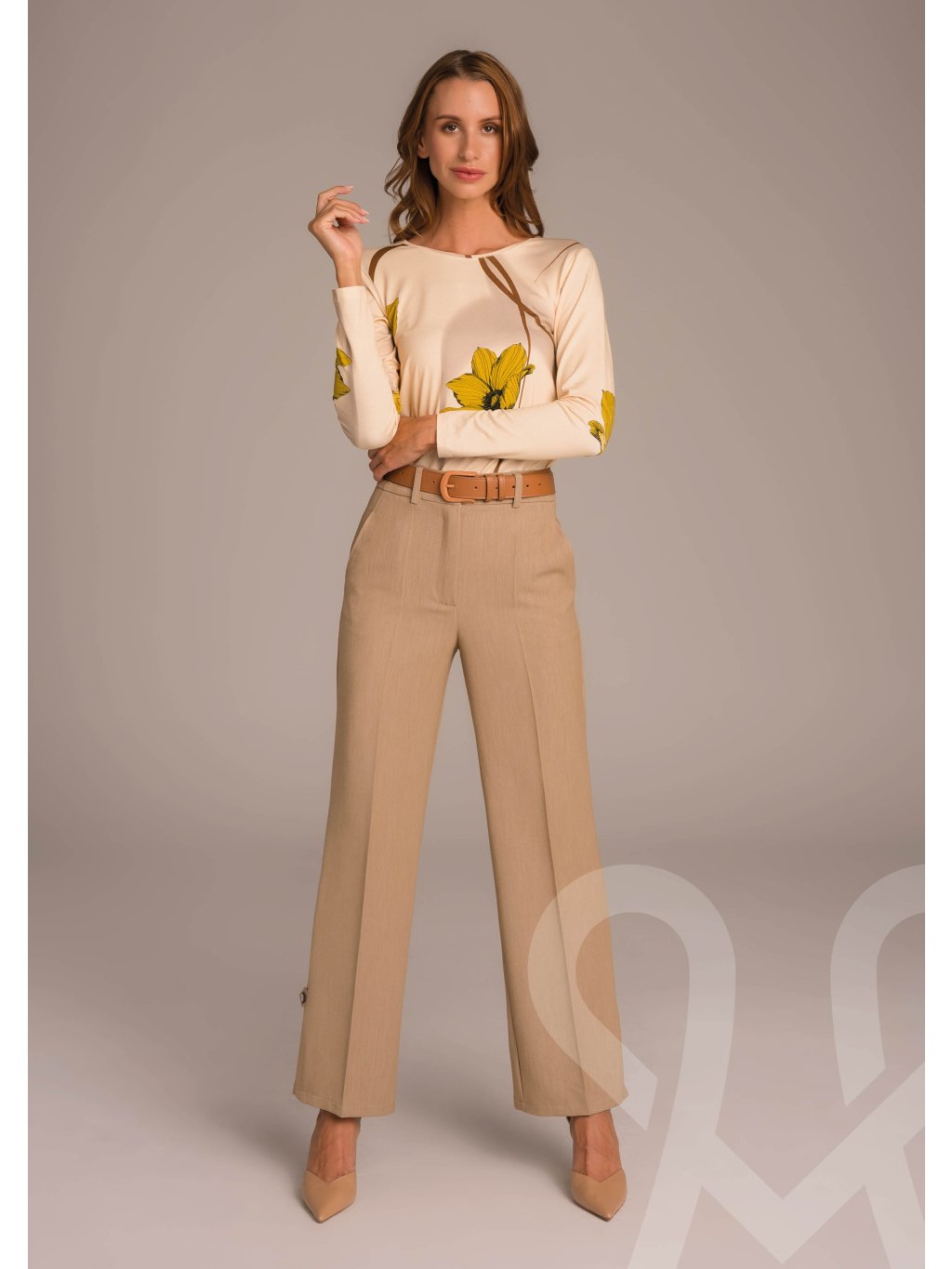 Magenta top na obrázku je elegantný, s dlhými rukávmi a svetlým béžovým základom. Je ozdobený veľkými žltými kvetinovými motívmi na prednej časti aj rukávoch. Má jednoduchý, mierne priliehavý strih a jemne zaoblený výstrih, ktorý pôsobí žensky a sofistikovane.
