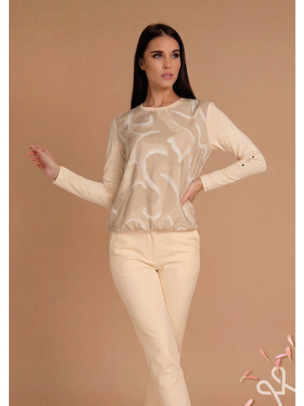 Elegantný a moderný dámsky MAGENTA top, ktorý je ideálnou voľbou na každodenné nosenie aj do práce. Príjemný a ľahký materiál poskytuje komfort počas celého dňa, zatiaľ čo jemný abstraktný vzor na prednej časti dodáva modelu štýlový a originálny vzhľad. Top má dlhé rukávy a pohodlný strih, vďaka čomu sa ľahko kombinuje s nohavicami, sukňou alebo elegantnými nohavicami. Neutrálne béžové tóny vytvárajú nadčasový kúsok, ktorý sa hodí do každého šatníka.