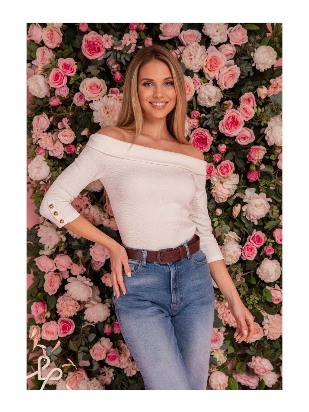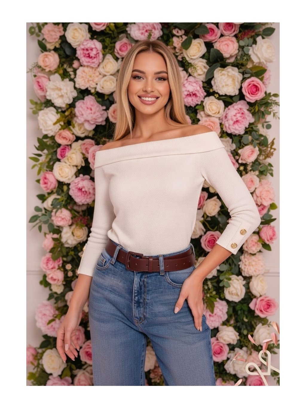Elegantný dámsky MAGENTA top v jemnom krémovom odtieni je dokonalou kombináciou ženskosti a nadčasového štýlu. Výrazný „off-shoulder“ výstrih odhaľujúci ramená pôsobí sofistikovane a zároveň veľmi žensky, čím krásne zvýrazní líniu krku a dekoltu.Materiál s jemnou štruktúrou dodáva modelu luxusný vzhľad a zaručuje príjemný pocit pri nosení. Priliehavý strih zvýrazní siluetu, zatiaľ čo trojštvrťové rukávy s ozdobnými gombíkmi prinášajú decentný, no štýlový detail.Top sa perfektne kombinuje s džínsami pre ležérne elegantný outfit, no rovnako dobre vynikne aj v spojení so sukňou či nohavicami s vysokým pásom. Ideálna voľba na stretnutie, spoločenskú udalosť aj chvíle, keď chcete pôsobiť upravene a sebavedomo.