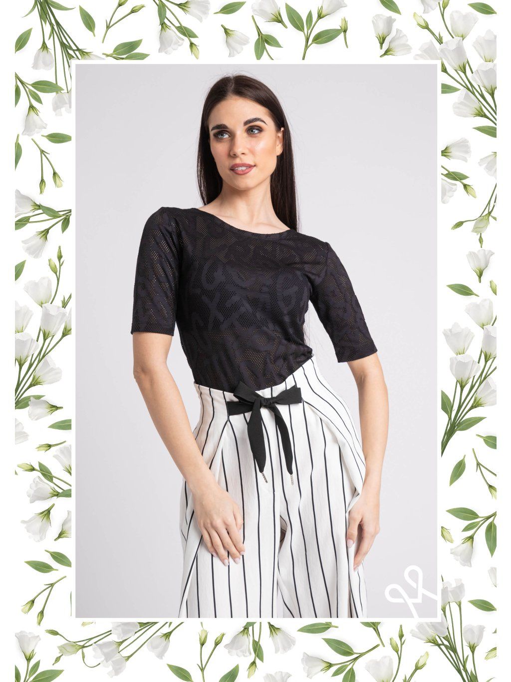 Priliehavý strih krásne kopíruje postavu a zvýrazňuje siluetu, zatiaľ čo krátke rukávy a klasický okrúhly výstrih pôsobia nadčasovo a vkusne. Transparentná štruktúra látky jemne odhaľuje pokožku, čím vytvára zaujímavý a ženský efekt bez toho, aby pôsobil príliš odvážne.