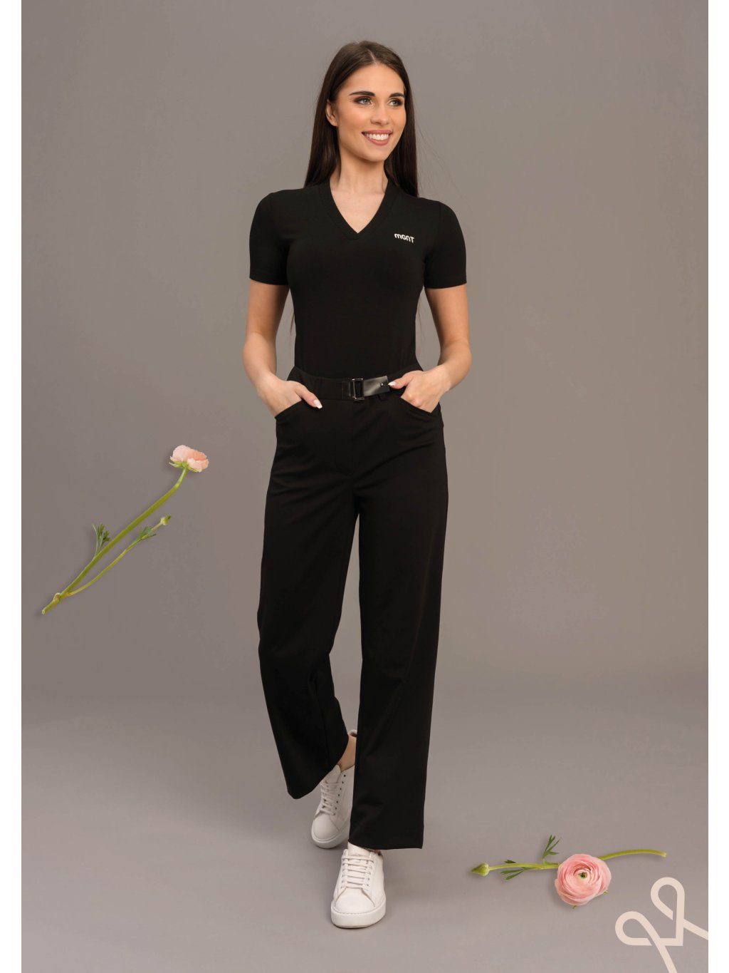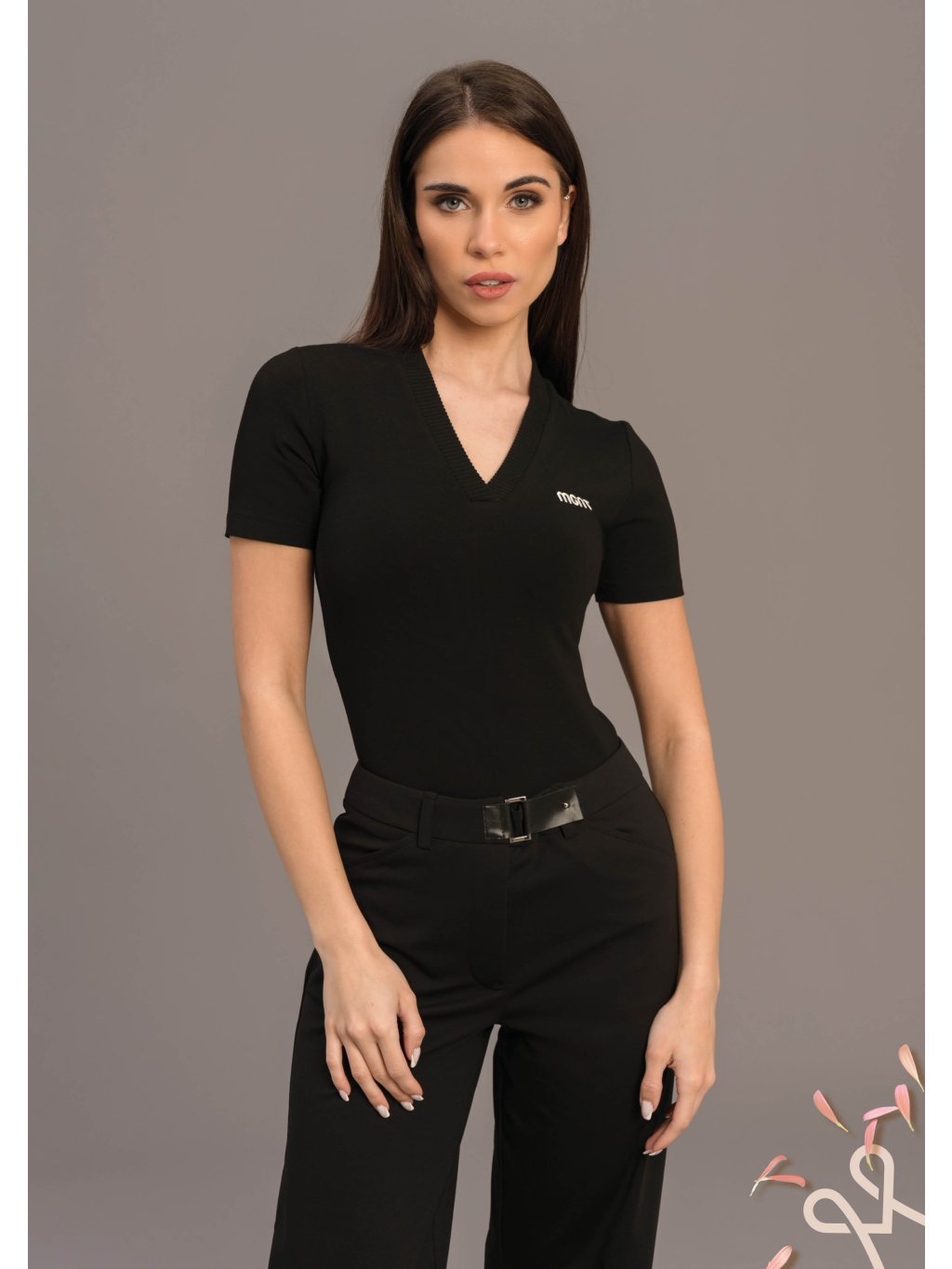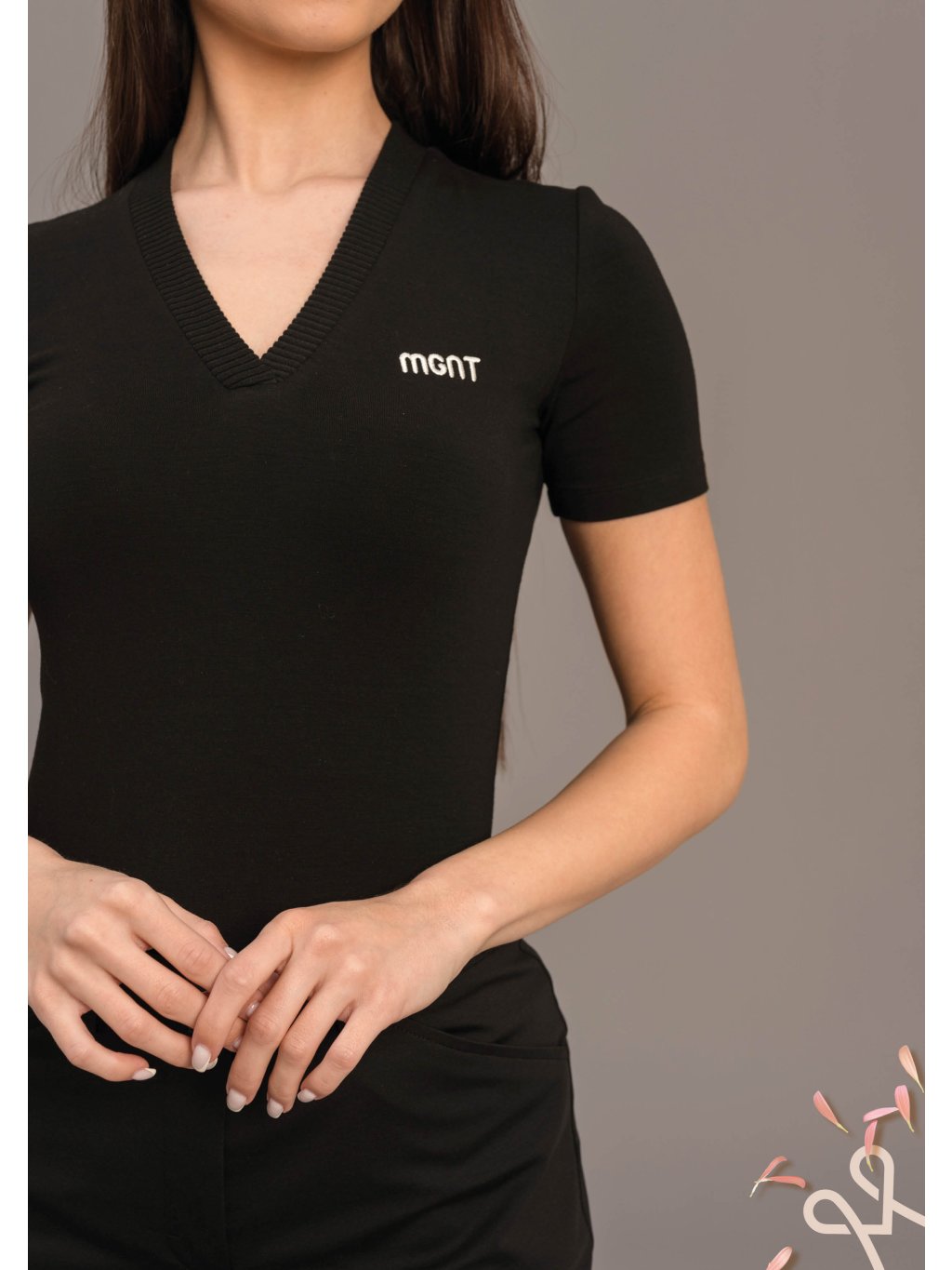 Elegantný základ šatníka, ktorý spája jednoduchosť s moderným detailom. Tento priliehavý čierny MAGENTA top s jemným V-výstrihom krásne zvýrazní líniu krku a pôsobí žensky a sofistikovane.Krátke rukávy a elastický, príjemný materiál zabezpečujú pohodlie počas celého dňa. Decentné logo na hrudi dodáva modelu minimalistický, no zároveň štýlový akcent. Top sa perfektne hodí k nohaviciam s vysokým pásom, sukni aj džínsom – ľahko s ním vytvoríte elegantný aj ležérny outfit.