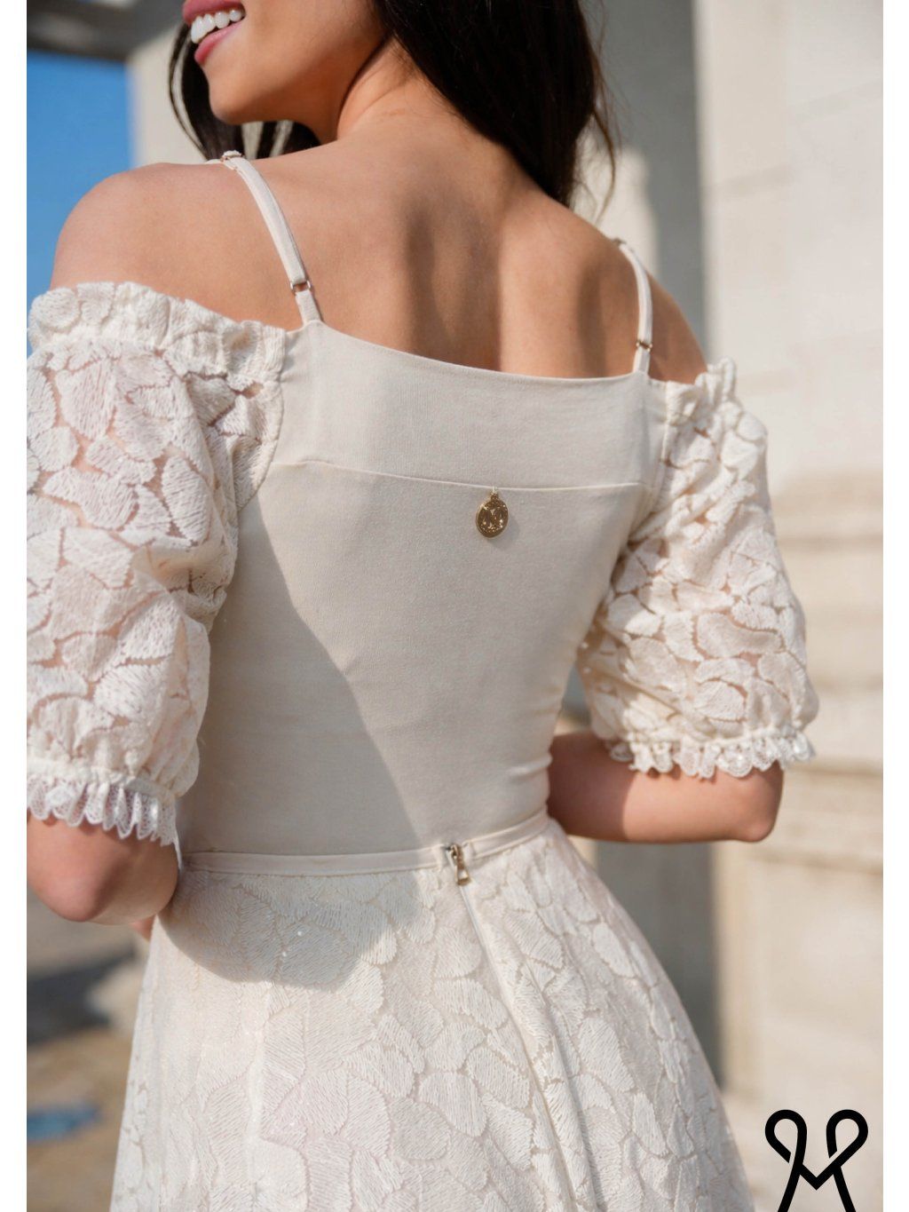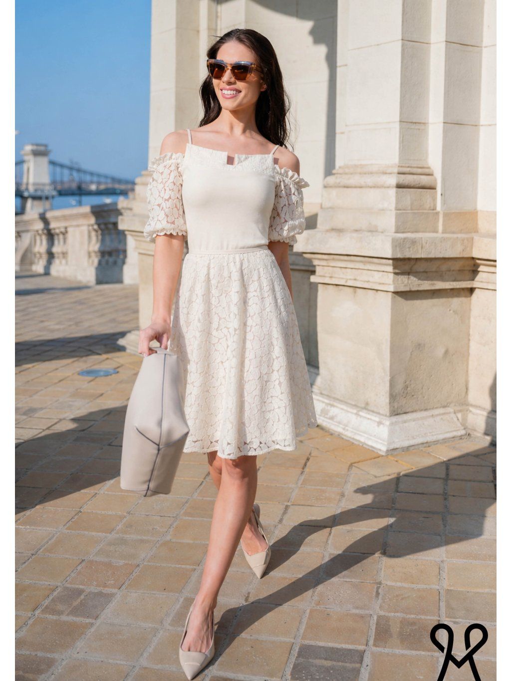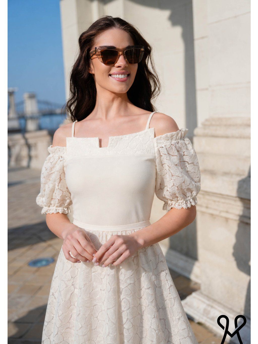Elegantný dámsky MAGENTA top v elegantnom krémovom odtieni zaujme svojím romantickým a ženským dizajnom. Priliehavý strih krásne zvýrazní siluetu, zatiaľ čo odhalené ramená na tenkých ramienkach pôsobia jemne a zvodne. Krátke nadýchané rukávy s čipkovaným efektom dodávajú modelu originalitu a sofistikovaný vzhľad. Príjemný materiál zabezpečuje komfort počas celého dňa. Ideálny kúsok na letné dni aj špeciálne príležitosti.