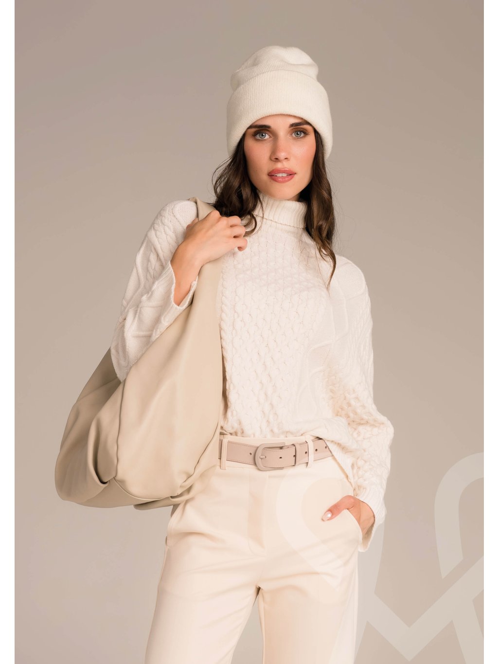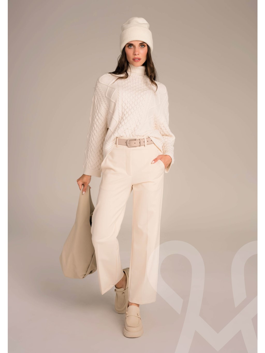 Dámsky pletený MAGENTA top v jemnej krémovo-bielej farbe, ktorý pôsobí hrejivo, elegantne a štýlovo. Top je vyrobený z mäkkého úpletu s výraznou vrkočovou štruktúrou, ktorá dodáva modelu klasický zimný charakter. Má voľnejší strih, ktorý poskytuje maximálne pohodlie, a rolákový golier, ktorý chráni pred chladom a zároveň pôsobí sofistikovane. Dlhé rukávy sú zakončené jemnými manžetami, čo zaručuje pekné držanie tvaru. Tento pletený kúsok je ideálny na chladné dni – skvele sa kombinuje s elegantnými nohavicami, džínsami či sukňou. Nadčasový, mäkký a ženský sveter, ktorý spája štýl a komfort v jednom.