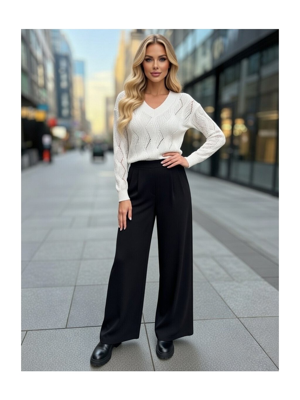 Elegantný svetrík v klasickej snehobielej farbe zaujme precíznym ažúrovým pletením s vertikálnym vlnkovým vzorom, ktorý opticky predlžuje postavu a dodáva modelu ženský, romantický nádych.
